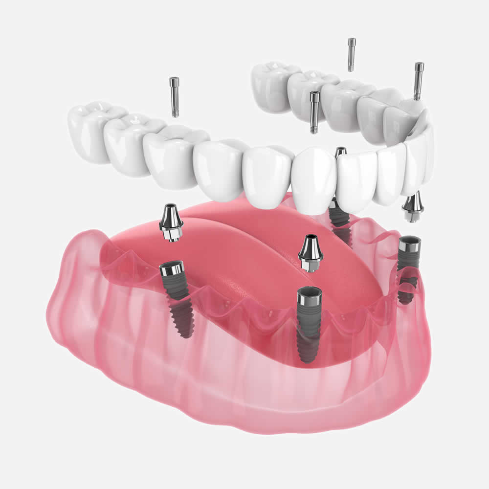 The All-on-4® treatment concept is a full-arch implant rehabilitation technique that restores an entire upper or lower arch using four strategically positioned dental implants. Two implants are placed vertically in the anterior region, while the posterior implants are angled to engage areas of higher bone density. This configuration maximizes implant stability, optimizes load distribution, and often eliminates the need for bone grafting. The implants support a fixed, full-arch prosthesis that is designed to provide long-term function, strength, and natural aesthetics.